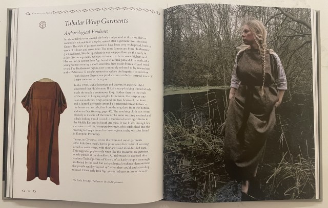 This is a handbook for recreating many ancient garments, and the author is both helpful and realistic in suggesting ways to approach the project in terms of authenticity. In one section there is a sidebar with a series of questions to consider before beginning a project, such as: Make, buy or re-purpose fabric and thread? Historical colours or favourite colours? Modern or reproduction tools? Hand sewing or machine sewing? The author is clearly onboard with spinning not only the wool to weave the cloth, but also the thread to sew the garment with buckthorn pins and hand-made bone needles.