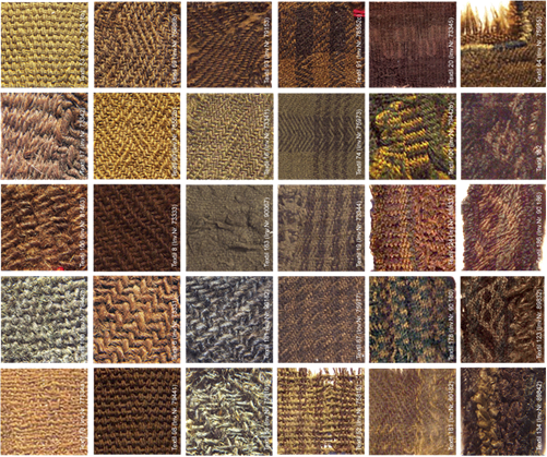 Of the hundreds of examples found, most are from woolen cloth, although some tablet-woven bands were discovered as well. Most of the weaves are twill, and many are of complex twill patterns such as point twill, herringbone, and diamond twill. There is evidence of the wool being dyed a variety of colours, including red, blue, green and yellow, and these colours were then used to make designs of check, stripe and plaid.