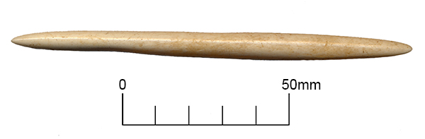 Double-ended Pin Beater: This is sometimes described as a ‘cigar-shaped’ beater because of its size and shape – wider in the middle and tapered at both ends. This can be used to stroke the warp threads into alignment and untangle or re-position threads as necessary (Hoffmann 1974: 135, 320, 419). This tool has been seen alongside loom weights in the Roman period (Wild 1970: 66, 134, 156) as well as in Anglo-Saxon sites like Sutton Courtenay in Oxfordshire and Maxey, Northamptonshire (Addyman 1964: 64).